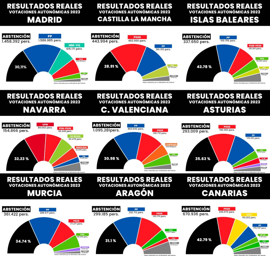 Por último destacar que la abstención del 36,09% fue la tercera más alta de la historia de la partidocracia desde 1991, y que han crecido significativamente los votos nulos y votos en blanco: 643.208 el 2,84% (frente a los 425.692, el 1,85%, de los anteriores comicios). ¡La sociedad de señas cada vez mayores de su rechazo al sistema!